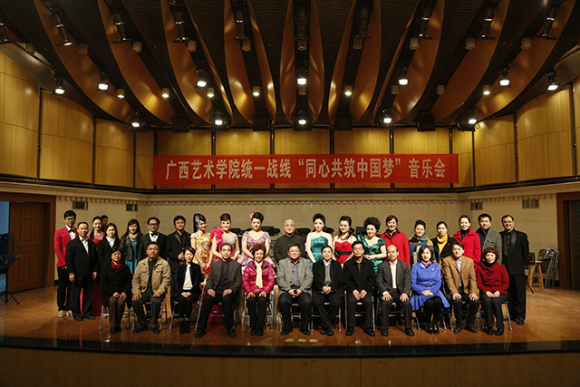 音乐,如一杯美酒,芳香甘醇;音乐,似一滴雨露,润物无声。为了喜迎新年,同心庆祝十八届三中全会的胜利召开,表达我院统一战线对党的深情,12月30日下午我院在音乐厅举办统一战线“同心共筑中国梦”音乐会。学院领导邓军、禤思、赵焕春、李沛新、韦俊平出席音乐会。此外,本次音乐会邀请到了自治区党委统战部、自治区政协办公厅、各民主党派区委、自治区党外知识联谊会、广西海外联谊会、自治区侨联、自治区高校工委的领导和嘉宾们的莅临。