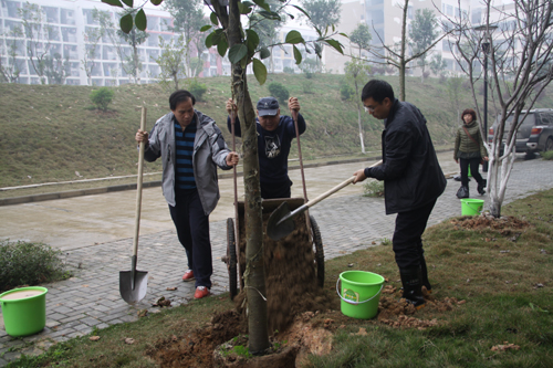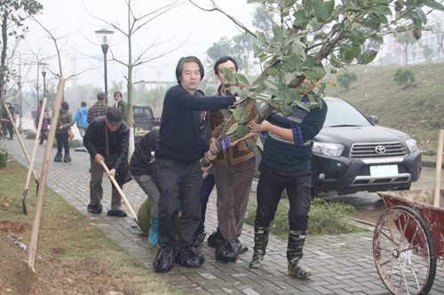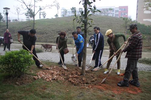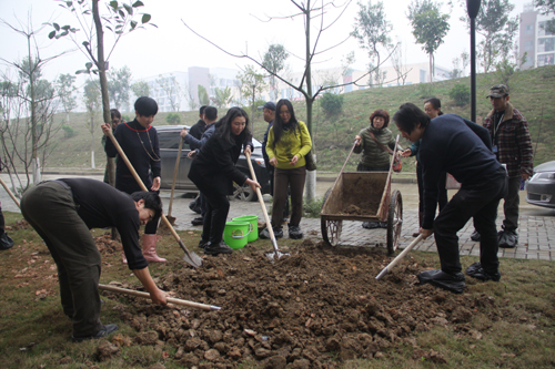 在活动现场,大家相互配合、分工协作,推车铲泥、扶树培土、精心浇灌,干得热火朝天,忙得不亦乐乎,很快就栽种了10棵寓意“同心”的木菠萝树,以实际行动参与到美丽校园、生态校园、和谐校园的建设当中。