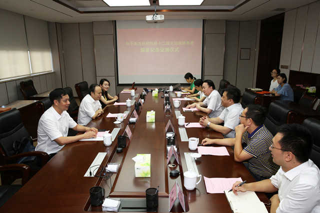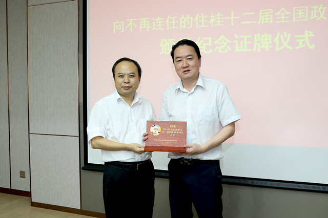 7月26日下午,自治区政协秘书长、办公厅主任王西翼莅临m88明昇,亲自向不再连任的住桂十二届全国政协常委郑军里校长颁发纪念证牌。自治区政协副秘书长、办公厅副主任廖冰,办公厅选举联络工作办公室副主任刘树义及学校党委副书记毛茂林,党办院办、组织部、宣传部、统战部等负责同志参加了颁发仪式。