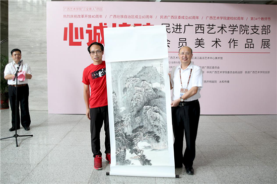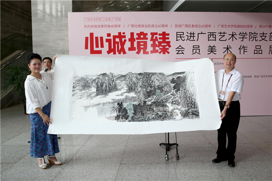 下午3:30,首先在学校南湖校区漓江画派艺术中心大楼一楼举行了“心诚境臻”画展开幕。原致公党中央副主席、自治区政协副主席我院院长黄格胜教授,自治区人大常委会副主任、民进自治区主委杨静华,学校党委书记蔡昌卓,党委副书记毛茂林,党委副书记、纪委书记李沛新,副院长陈应鑫,总会计师韦春灵等领导出席画展开幕式,画展开幕式由学校党委副书记毛茂林主持。