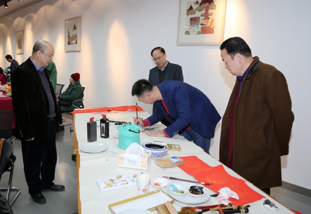 茶话会上,除了文艺演出之外还举办了统一战线同心现场笔会,郑军里校长等党外领导教师挥毫泼墨书写“福”字、春联,集体创作中国画作品,活动现场气氛喜庆祥和,其乐融融,共同祝福学校明天发展更好。